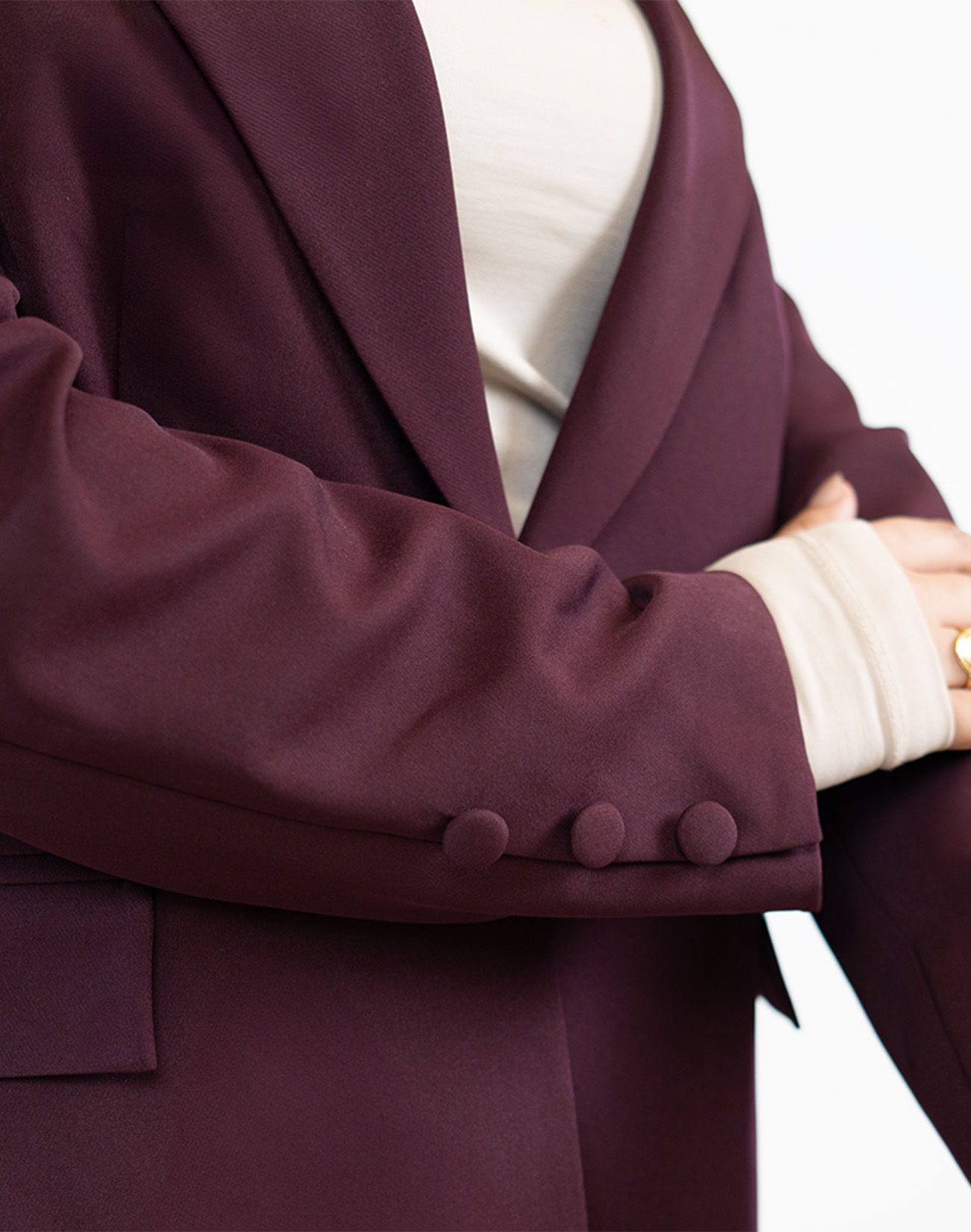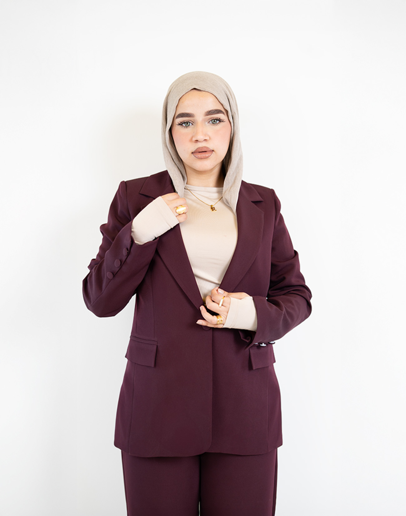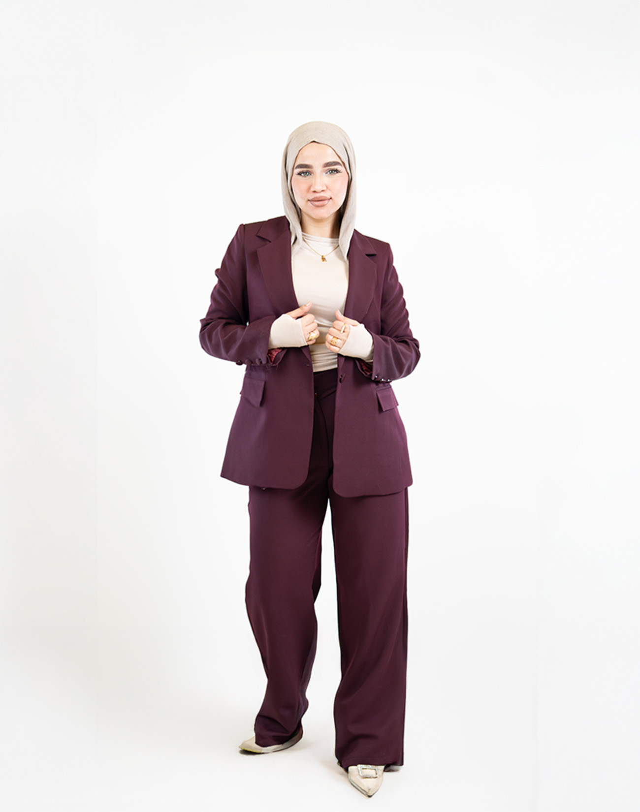 Two-piece formal suit set featuring a blazer and matching trousers. Designed for a polished, modest-friendly look for work and occasions.