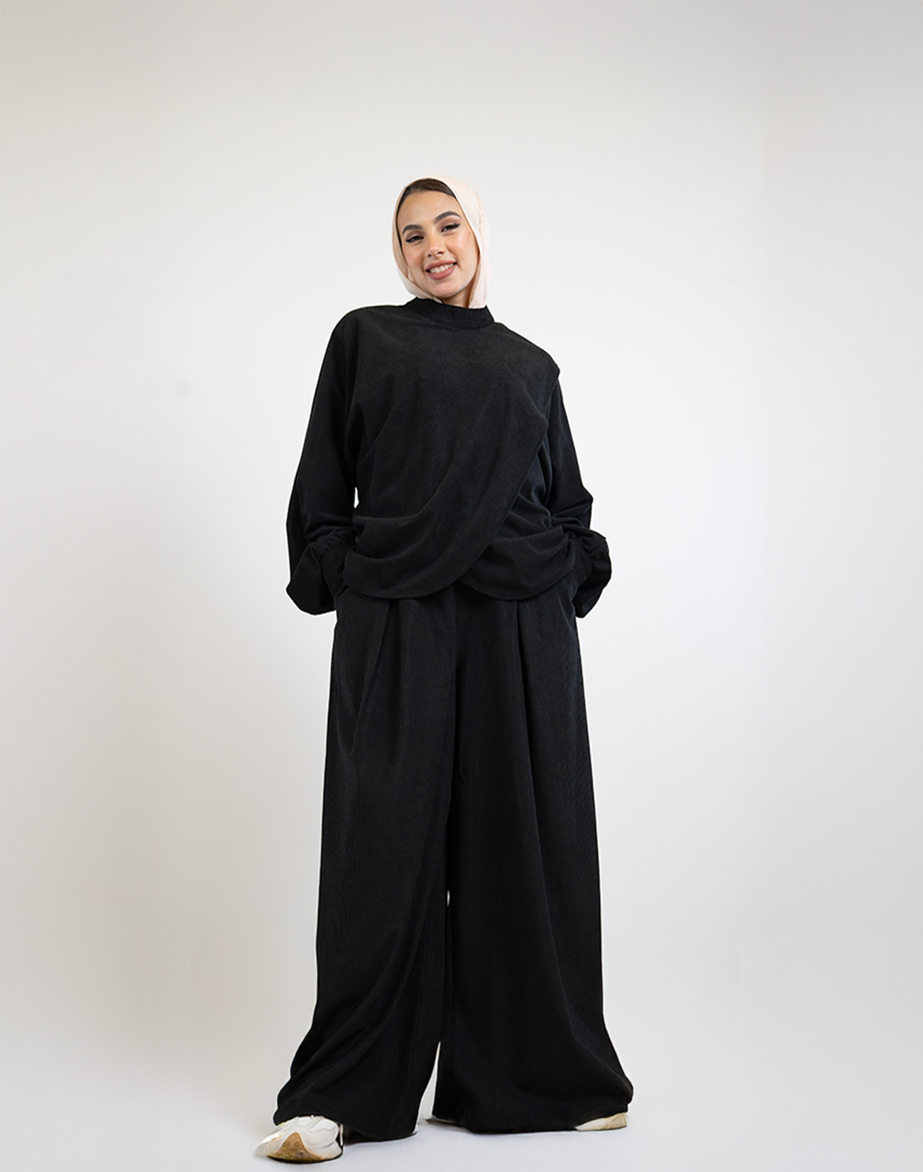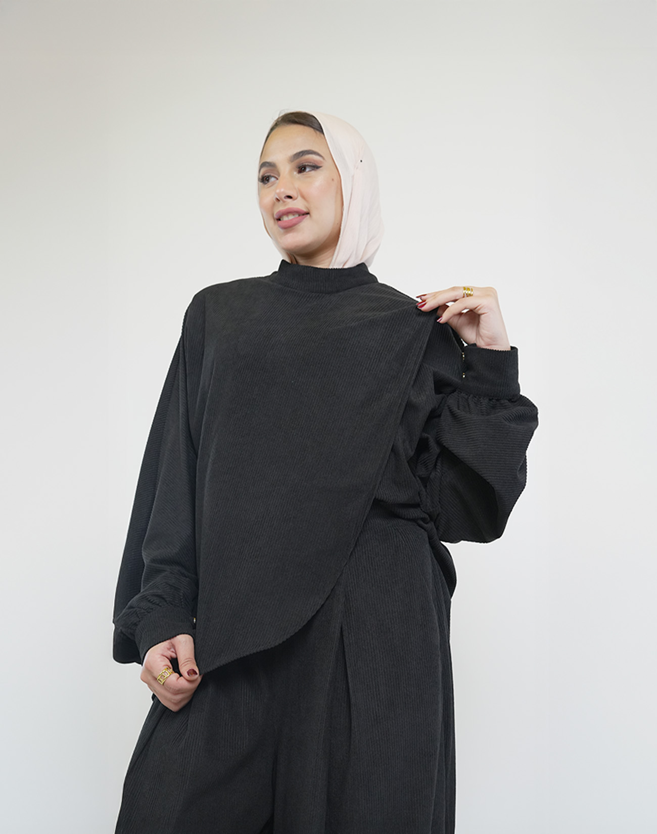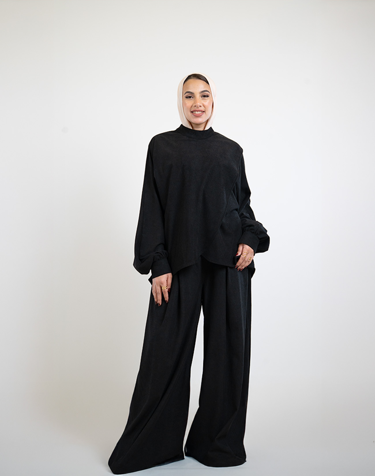 Two-piece set featuring a croisé (wrap-style) detail and matching trousers. One size for easy styling.