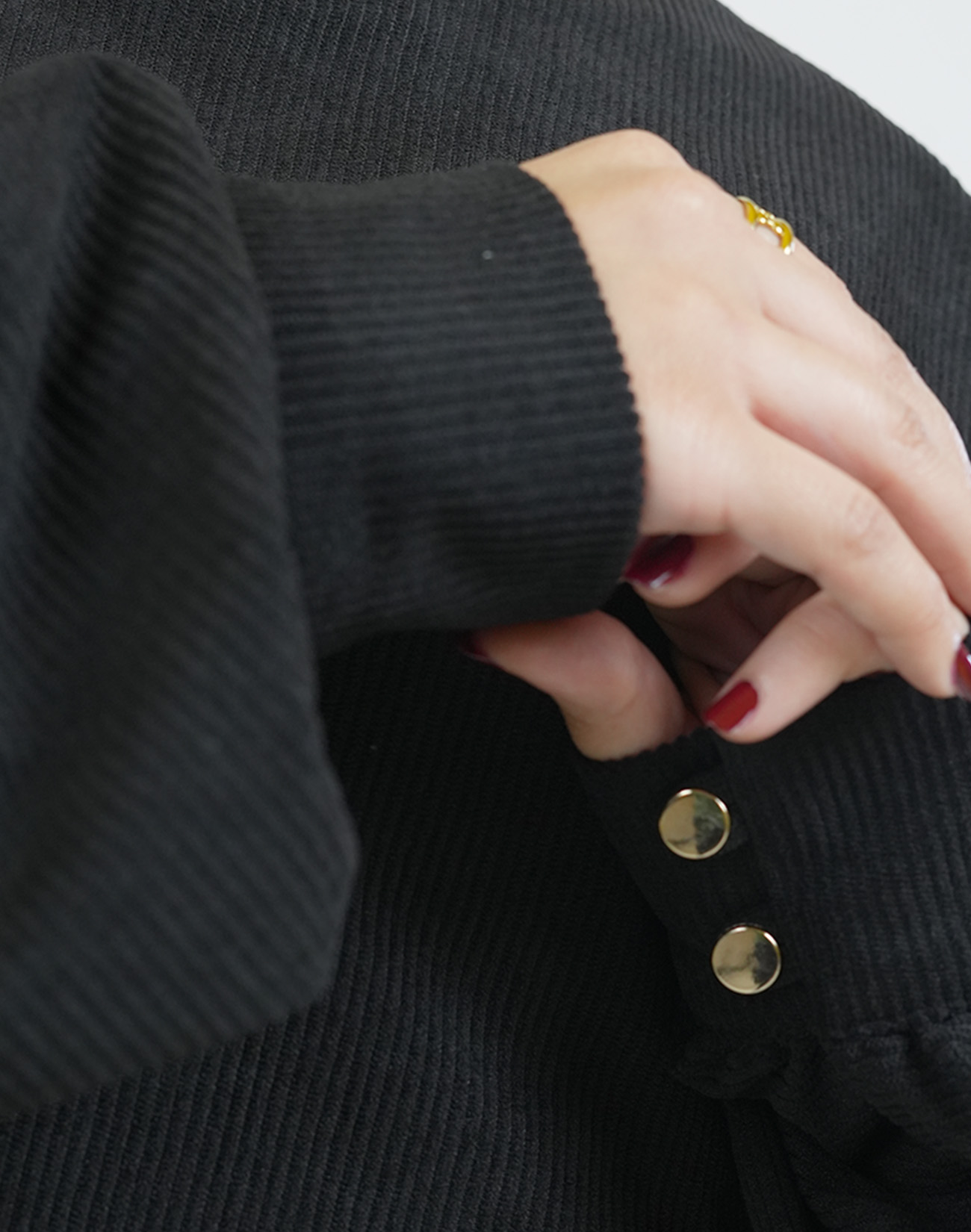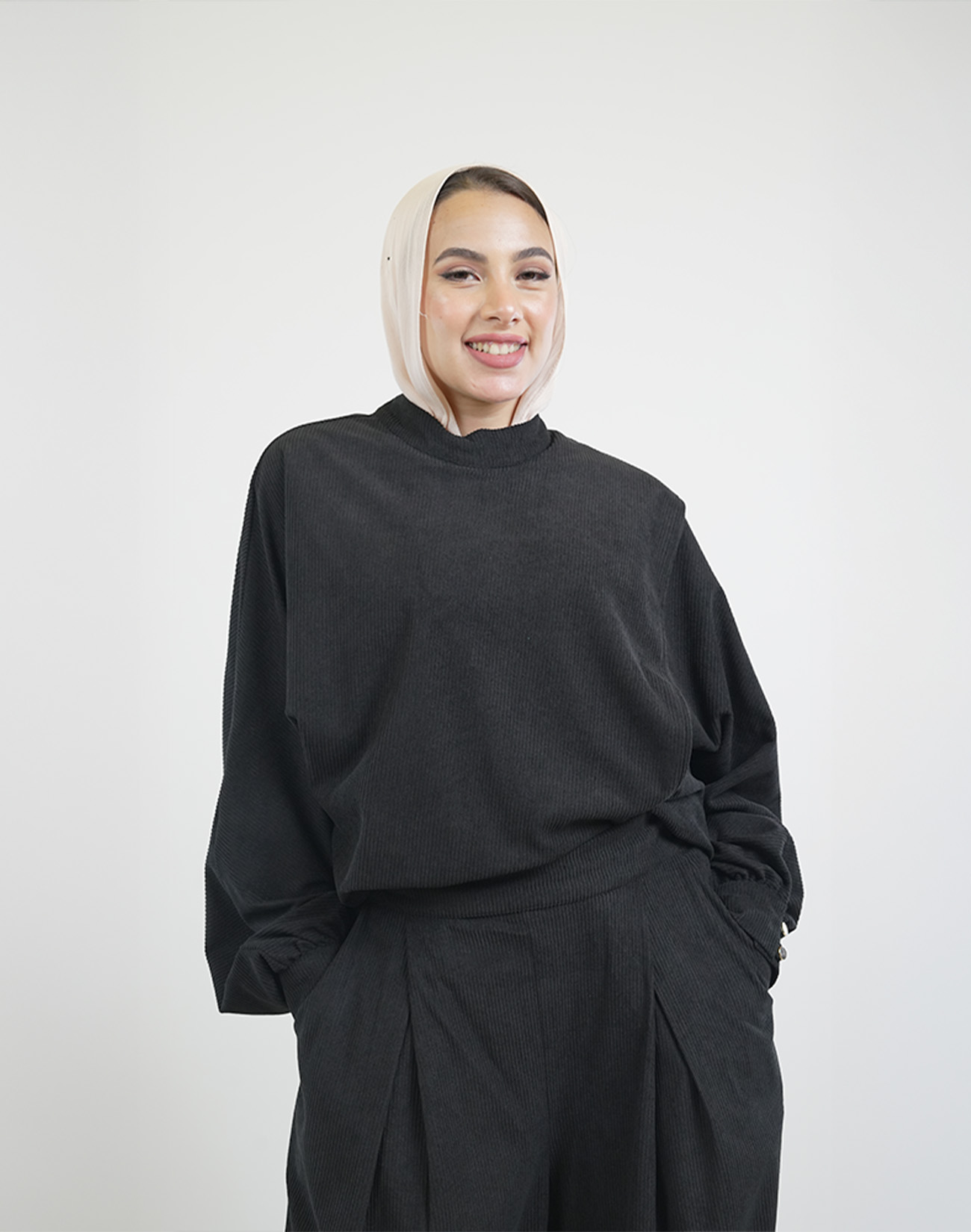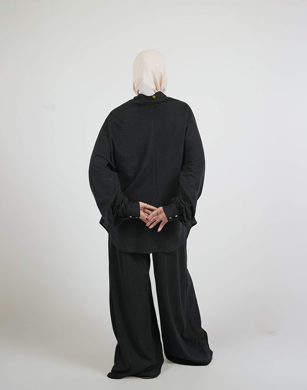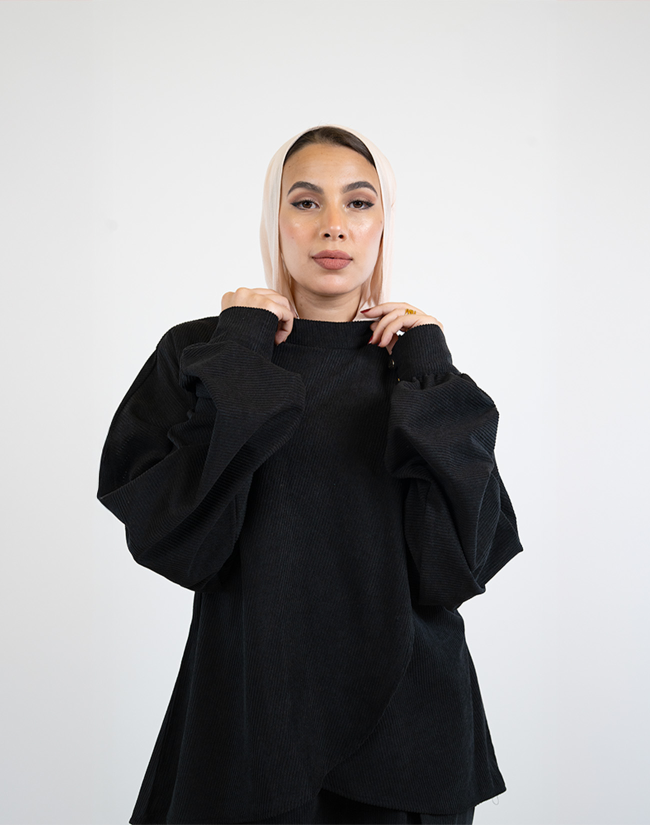 Two-piece set featuring a croisé (wrap-style) detail and matching trousers. One size for easy styling.
